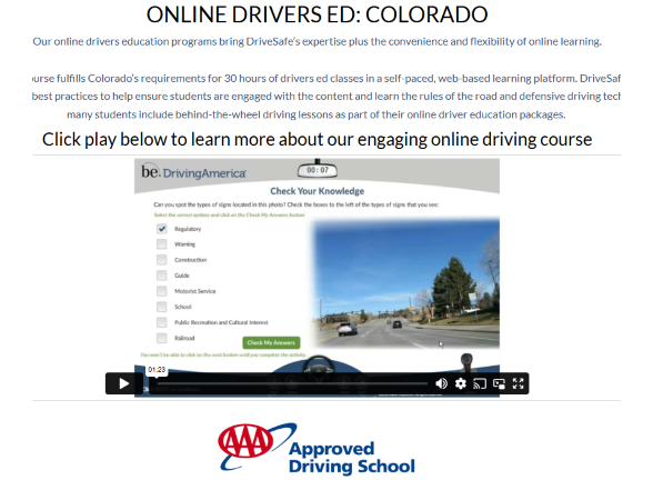 Prepare yourself for a lifetime of safe driving! Get peace of mind and save on insurance with our state-certified teen driver's education program. The program meets state requirements for 30 hours of classroom instruction and includes the permit test. For students who prefer to work at their own pace, the online 30-hour driver’s education program is a convenient, interactive and fun option that you can do anytime, anywhere, using any computer or tablet device.This in-depth driver’s education program, designed by Colorado driver’s education professionals, includes videos, activities and quizzes to foster lifelong learning. You can take the permit test at a DriveSafe location or at the DMV. The course certificate is valid for 6 months and students can take the permit test when they are at least 14 years and 11 months old.